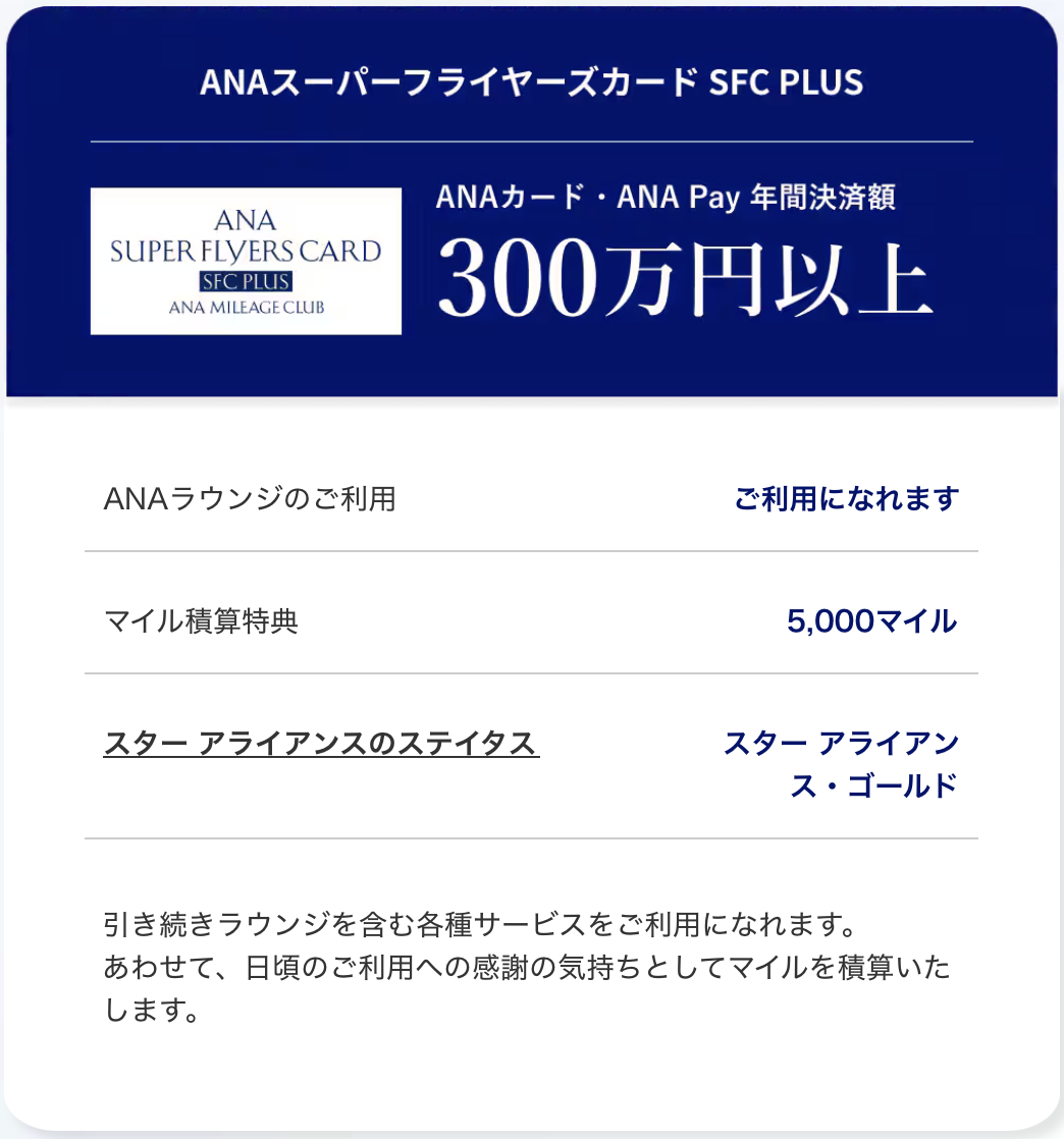 ファーストやビジネスしか乗らない人はSFCのサービスは関係ないのですが、飛行機をよく利用する海外赴任者は余程日本への帰国とかをしてANAカードを使わない限りほぼ間違いなく決済額300万円は到達しません。