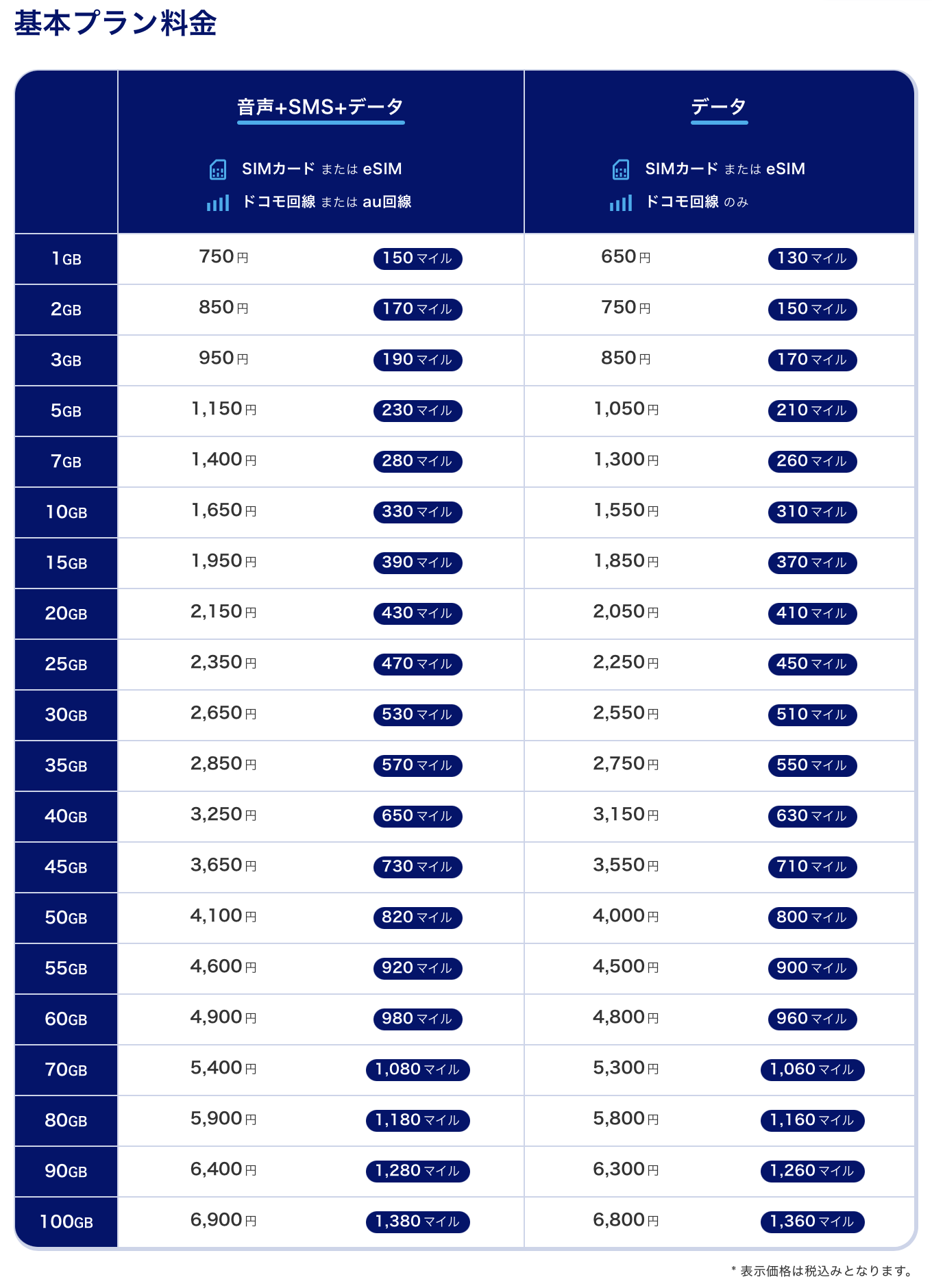 データ容量30GB契約=530マイル/月x12ヶ月=6,360マイル貯まります。