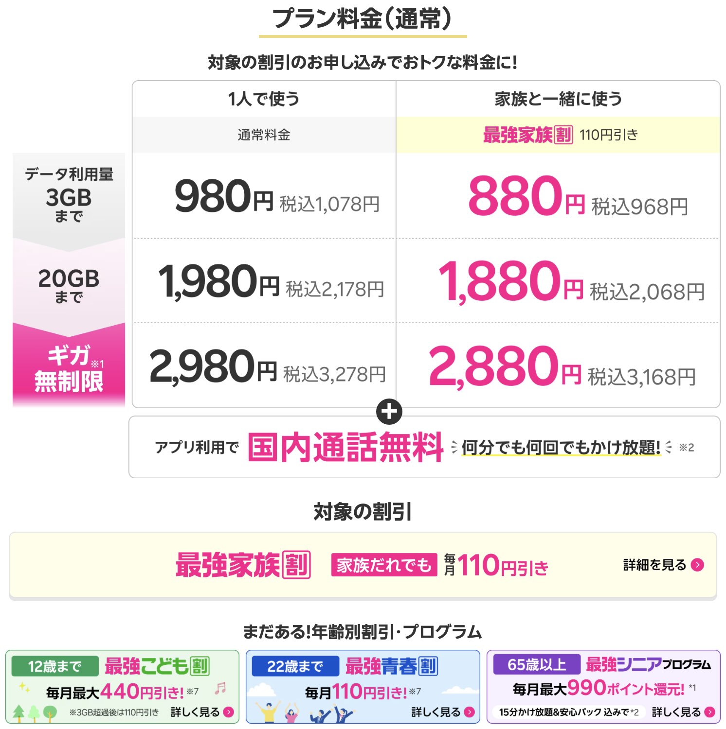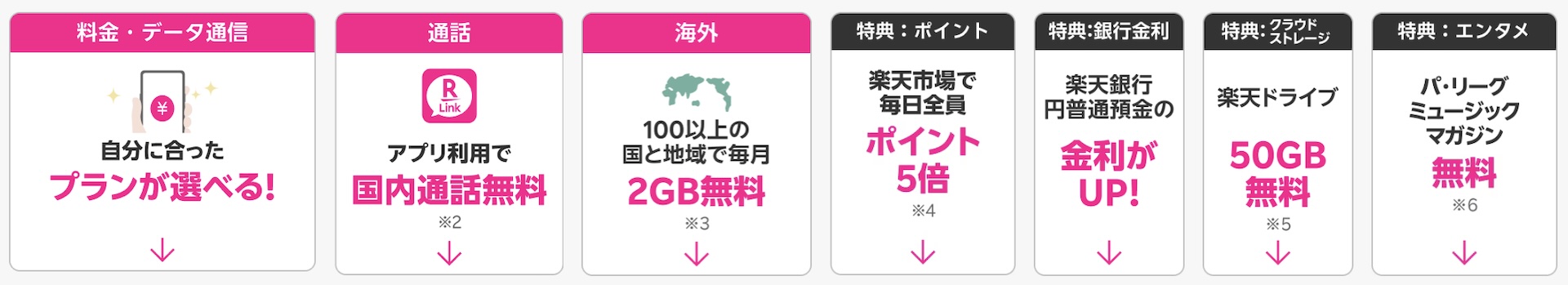 プランは1つのみ、楽天グループのサービスを利用するとポイントがより多く貰えますし、海外での利用も2GBとはいえ海外旅行に定期的に行く人にとっては便利だと思います。